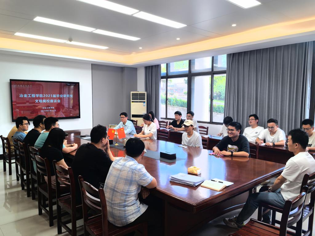 6月13日,冶金工程学院于秀山校区冶金楼南317会议室召开2025届毕业研究生文明离校座谈会。院党委副书记、纪委书记、副院长朱艳飞,副院长赵卓,以及各班级研究生毕业生代表参加了座谈会,座谈会由辅导员吴巍主持。