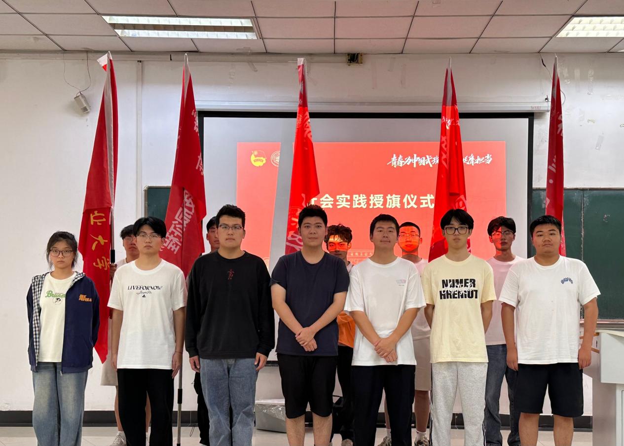 仪式上,学院社会实践队总队长唐添添介绍了本次暑期社会实践的主题、目标及意义,明确了实践方向和任务要求。校优秀社会实践团队成员朱琛宇、王好结合自身实践经历,分享了参与社会调研、志愿服务等方面的成果与经验,为同学们提供了有益参考。随后,孙晨老师为学院各社会实践队授旗,强调在暑期社会实践期间要牢固树立“安全第一”的观念,鼓励同学们勇于探索、敢于创新,展现安工大学子的良好风貌,在实践中提升综合素质和社会责任感。