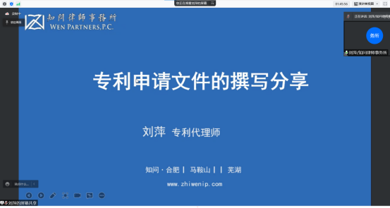 4月5日,冶金工程学院第17期创新创业训练营邀请安徽知问律师事务所专利代理师刘萍,给同学们线上进行题为《专利申请文件的撰写分享》的培训,培训由训练营班主任吴巍主持。