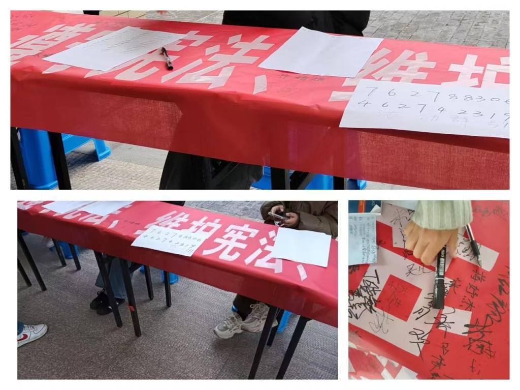 为进一步扩大宪法宣传的覆盖面和影响力,学院开展了“宪法宣传周”主题横幅征集活动。学生们积极参与,设计出多条富有创意和正能量的横幅标语,如“尊崇宪法,维护宪法权威”、“宪法在心中,法治在行动”等。吸引了众多师生驻足观看,进一步加深了大家对宪法的认识。
