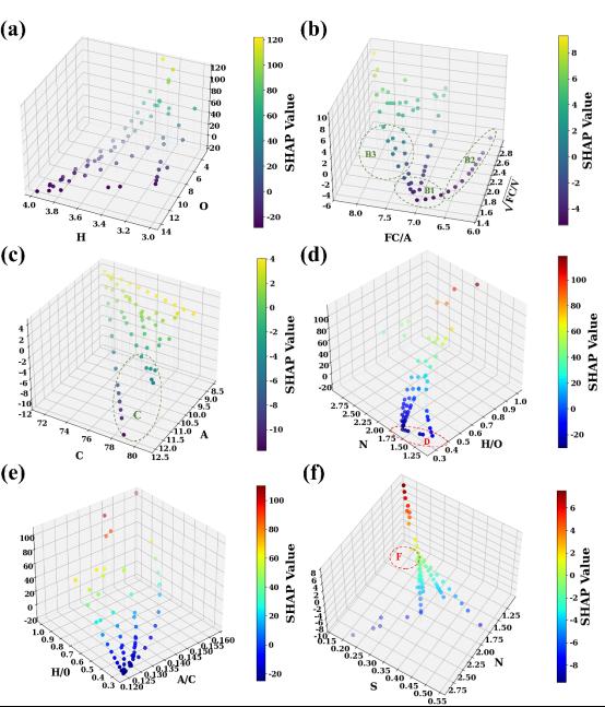 为解决模型可解释性问题,团队引入了SHapley Additive exPlanations分析框架,系统揭示了氢氧元素比等关键特征对煤炭着火温度的影响规律。通过三维可视化技术,研究进一步呈现出多特征之间复杂的协同作用关系。值得关注的是,模型分析所得规律与已有文献中的燃烧机理研究结论一致,这不仅验证了预测结果的可靠性,更使模型具备了清晰的物理意义,为深入理解煤炭燃烧过程提供了新的视角。