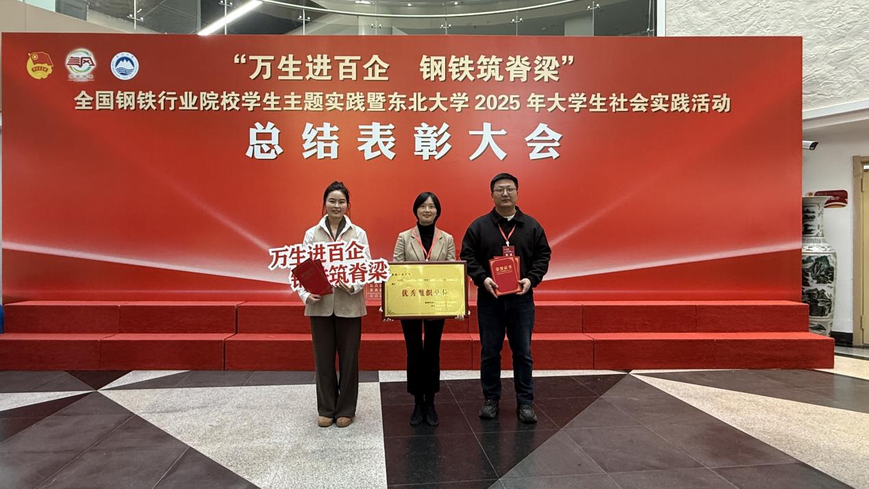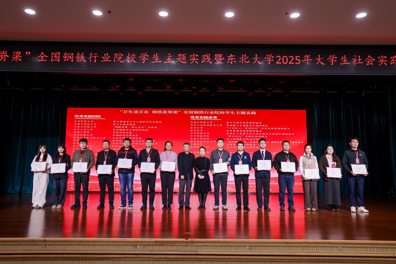 12月3日,2025年新时代高校“钢筋铁骨”育人共同体“万生进百企、钢铁筑脊梁”全国钢铁行业院校学生主题实践总结表彰大会在东北大学举行。我院“向胜利八十年致敬:‘铁炉寻迹’”调研团获评优秀团队,博士科技服务团技术方案获评优秀成果。自该社会实践专项设立以来,我院连续两年同时荣获“优秀团队”和“优秀成果”奖项。