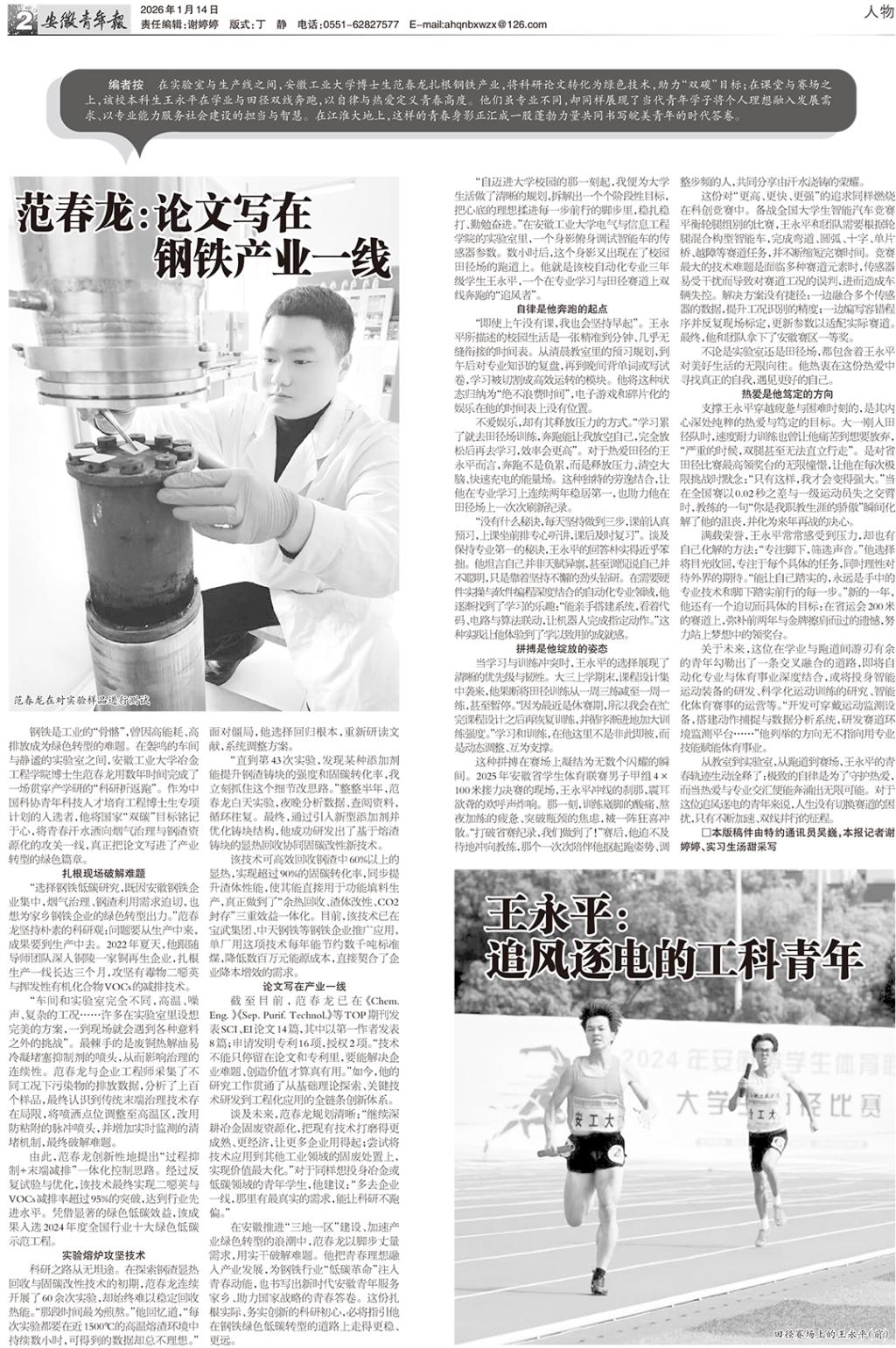 2026年1月14日,《安徽青年报》在其纸质报纸第02版以《范春龙:论文写在钢铁产业一线》为题,刊发对我院2024级冶金工程专业博士生范春龙的专题报道。报道生动展现了范春龙作为一名青年科研工作者,将论文写在祖国大地上,以科技创新服务产业绿色转型的责任担当与实干精神。