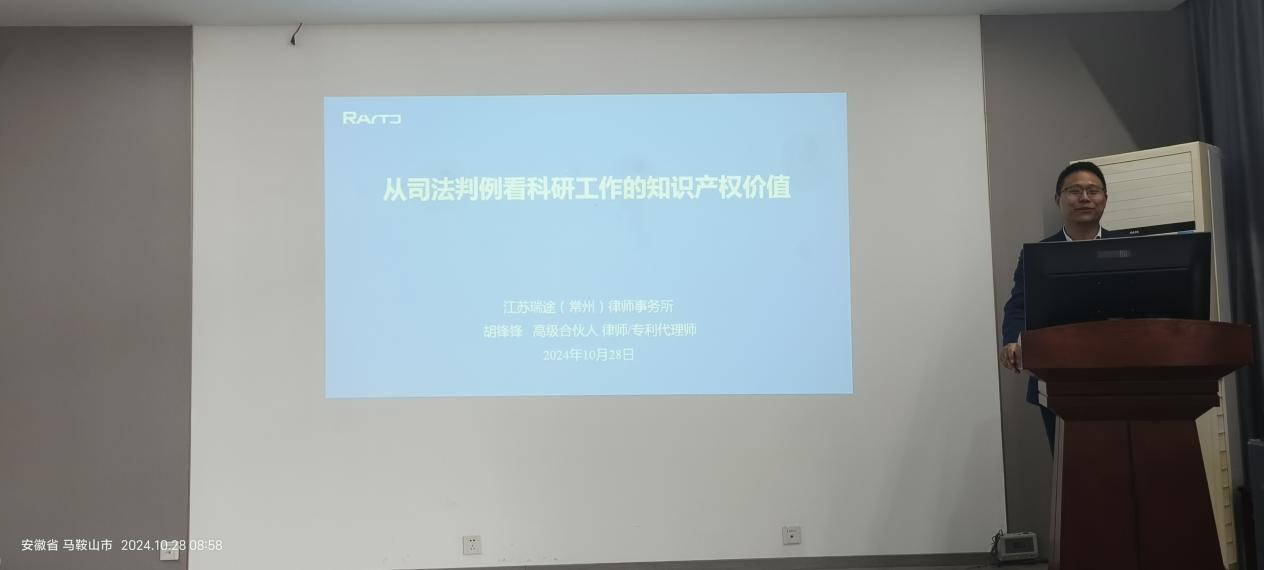 2024年10月28日上午9:00,冶金工程学院“点石成金”论坛系列讲座第十八讲在秀山校区冶金楼302会议室举行。本次讲座的主题是“从司法判例看科研工作的知识产权价值”,由江苏瑞途律师事务所执行主任、高级合伙人胡锋锋主讲。