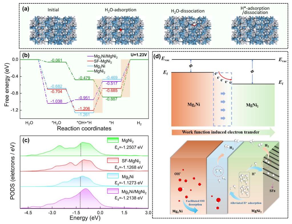 异相界和堆垛缺陷因其独特调节电子结构与d带中心的能力,是提高HER活性的有效手段。然而,由于两者调控机制存在差异,通过温和合成方法将这两种策略融合到一个简单的合成框架中仍存在较大挑战。团队创新性地采用熔盐电沉积策略,在镍基底上原位制备出富含堆垛缺陷的异质Mg-Ni合金(Mg2Ni/MgNi2)。该结构所构建的相界,充当了电子高效输运的“桥梁”,有效调控了电子结构与d带中心,显著提升了HER活性。采用该方法制备的Mg-Ni合金电极在碱性条件下仅需69.2 mV过电位即可驱动高效析氢反应,并在600 mA·cm-2的高电流密度下保持稳定运行。该研究不仅打破了“镁不适合HER”的传统观念,更重要的是为通过“相工程-缺陷工程”协同策略设计高效非贵金属催化剂提供了全新范式。