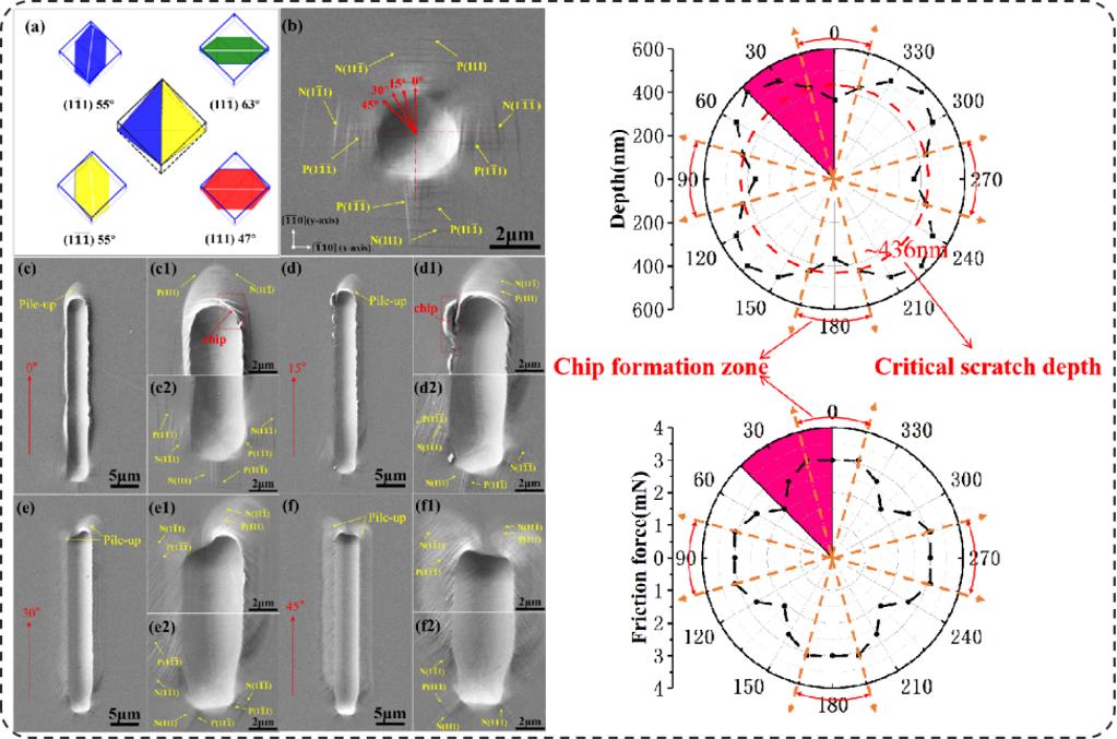 在金属摩擦过程中,接触表面的塑性变形对摩擦副的磨损特性及材料去除机制起着决定性作用,而切屑的生成更是材料磨损的主要表现形式之一。尽管如此,影响切屑形成的潜在微观机制仍未被完全揭示。针对这一关键科学问题,该研究采用微观压痕和划痕技术,系统探究了Fe-25Cr-20Ni奥氏体不锈钢中三种典型晶体取向({001}、{101}和{111})在不同划痕方向与载荷条件下的材料去除行为。研究揭示了材料在划痕载荷作用下从初始压痕接触、犁耕变形到最终切屑剥离的演化过程,发现晶体取向与划痕路径之间的耦合效应显著影响切屑形成机制。该成果深化了人们对面心立方金属在微观尺度摩擦行为的理解,为开发更高性能、耐磨损金属材料提供了理论支持与设计思路。